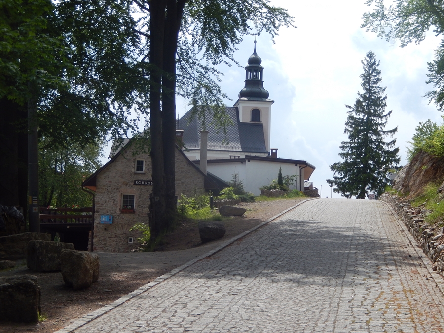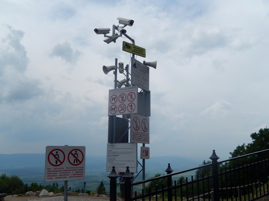 Z Marianówki szlak czerwony prowadzi nas na Igliczną (845 m n.p.m.) szczyt ze schroniskiem i Sanktuarium Matki Boskiej Śnieżnej, oddzielonych od siebie murem. Niegdyś było pomiędzy nimi bliskie przejście, jednakże urzędujący ksiądz je zamurował. Zdaje się, że walka między nimi trwa. Dziwnie to wygląda, gdy wchodzi się na teren przykościelny, widzi słup z kilkoma kamerami i wielkim napisem: zakaz fotografowania i filmowania. W kościele stoi pani, która odwiedzających prawie popycha na klęczki. Bo to nie do zwiedzania 😉 Cóż …