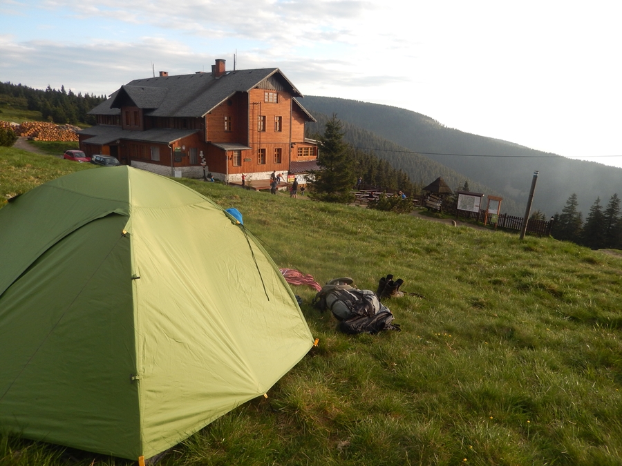 Kiedy dotarliśmy do Schroniska PTTK na Śnieżniku (właściwie na Hali pod Śnieżnikiem) kolejki już nie było. Za to nocujących tu rodzin z dziećmi – co niemiara! Cena za rozbicie namiotu przy schronisku – bezkonkurencyjna! 5 zł! Rozbiliśmy sobie namiot z widokiem na zachód słońca. I nawet nie pozabijałam wszystkich dzieci wrzeszczących do późna … Rano nie zwijając namiotu poszliśmy zielonym szlakiem na szczyt (około 30 minut w jedną stronę). Na szlaku nie było nikogo. Sam Śnieżnik (1426 m n.p.m.) też był pusty. Jeszcze poszliśmy na drugą stronę granicy do źródeł czeskiej rzeki Morawy, żeby podjąć skrytkę (geocaching) i wróciliśmy do schroniska, w którym ludzie się dopiero budzili. Powoli zwinęliśmy nasze obozowisko i zaczęliśmy schodzenie drogą na Przełęcz Śnieżnicką (1123 m n.p.m.). Pogoda zaczęła się psuć: ziemne chmury powoli napływały nad nasze głowy. Znów minęliśmy dziesiątki osób wspinających się na Śnieżnik. Większość z nich użyła wyciągu na Czarną Górę i teraz dosyć wygodną drogą zdobywała szczyt Śnieżnickiego Parku Krajobrazowego. O tak, zapomniałam dodać, że od dnia poprzedniego Główny Szlak Sudecki prowadzi nas przez park krajobrazowy.