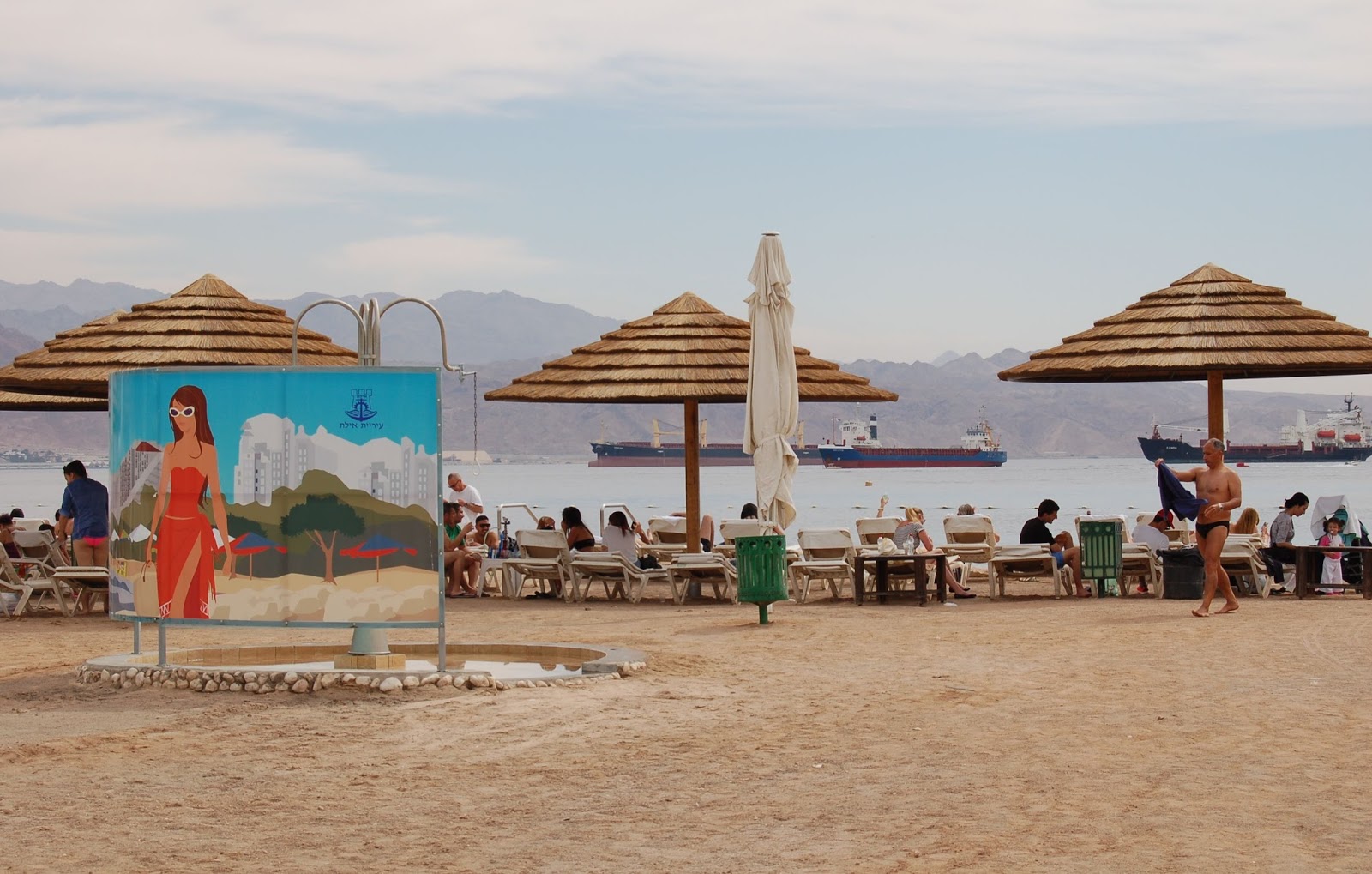 W Eilacie jesteśmy o świcie. Obieramy kierunek zachodni i maszerujemy. Jest wcześnie, ale według naszych obliczeń powinniśmy dojść do Eilat Field School akurat na siódmą, czyli blisko godzin otwarcia. Po drodze mijamy sporą liczbę porannych biegaczy. Płacimy za nocleg, rozbijamy się i ruszamy na zakupy (butla z gazem, jedzenie). No i pierwsze lody. Gorąco. Na plaży z widokiem na jordańskie góry pierwsi wczasowicze: