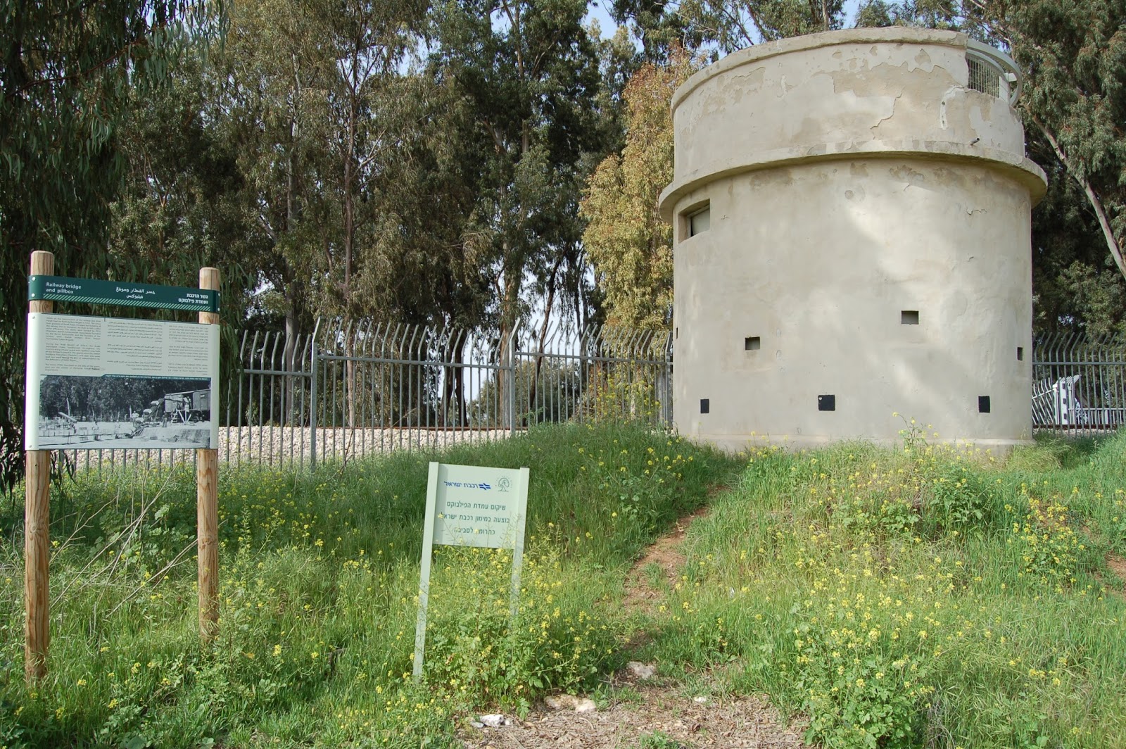 Przechodzimy obok wejścia do Parku Narodowego Źródeł rzeki Yarkon, czyli ścieku wzdłuż którego idziemy już od dłuższego czasu. Oczka wodne, nenufary, sporo ludzi. Ale my szukamy brytyjskiego bunkra z 1935 roku. Znaczy się teraz wiemy, że szukaliśmy bunkra, gdyż sprawdziliśmy znaczenie angielskiego słowa “pillbox“. Wówczas szukaliśmy raczej “czegoś” ważnego o czym napisano w naszym przewodniku, że znajduje się przy wejściu do parku. I dobrze, że obok postawiono tabliczkę informacyjną… Teraz już jesteśmy mądrzy i bogatsi o jedno angielskie słówko 🙂