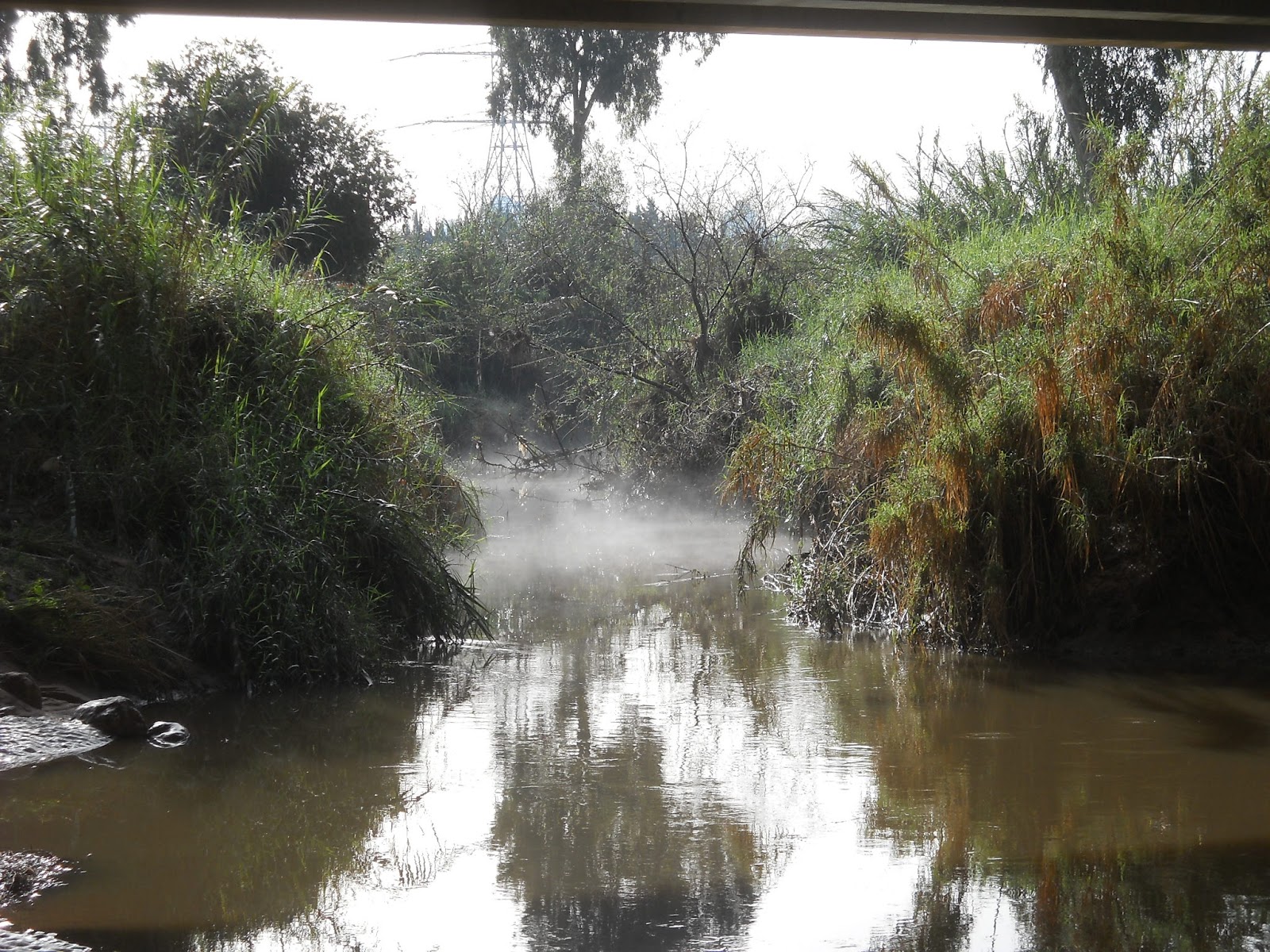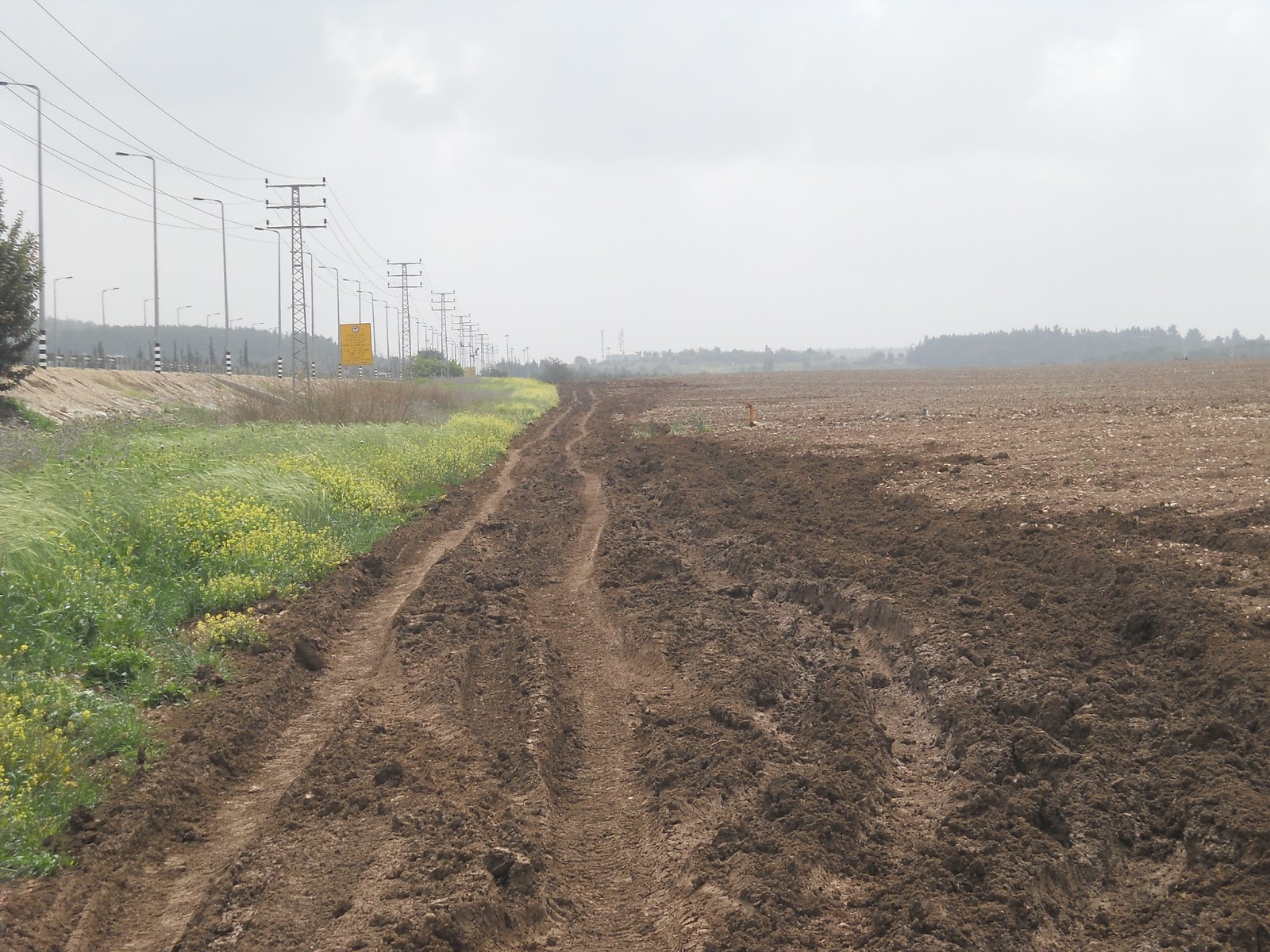 Zaraz za Ramat Gan’em skończyła się wypielęgnowana promenada nadrzeczna i szlak połączył się z polną drogą, biegnącą z jednej strony wzdłuż rzeczki a drugiej wzdłuż pól z drzewkami owocowymi.Rzeczka, znajdująca się pod ochroną, Nahal Yarkon, jest bardziej żrącym ściekiem, chwilami pełnym piany, jak niegdyś w rzece San poniżej Sanoka i zakładów mleczarskich. Droga, rozjeżdżona przez samochody z napędem na cztery koła, po dwóch dniach deszczów przemieniła się w bagno. I my pośrodku tego wszystkiego…. Zaraz na początku spotkaliśmy jednego z właścicieli sadów, który sugerował byśmy poszli naokoło, że błoto itp., ale użył zwykłego słowa “muddy”, dlatego też nie przejęliśmy się nim za bardzo. Błoto? Hej, przecież jesteśmy z Polski, u nas błota nie brakuje, a oni tutaj przecież panikują z powodu małego deszczu, więc z tym błotem przecież tak samo …