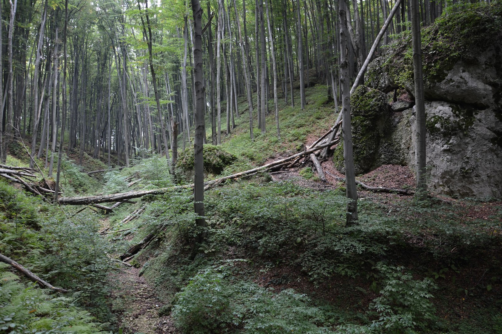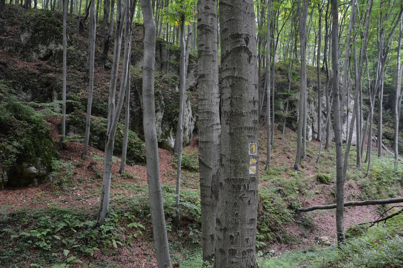 Cały czas leśną drogą, trochę rozjeżdżoną momentami, więc po deszczu przyda się dobre obuwie. Aż dochodzimy do tablicy nr 2, która obwieszcza nam początek Wąwozu Żarskiego. W jego stromych zboczach znajdują się skałki zbudowane z wapienia skalistego górnej jury. Znajdują się tu liczne schroniska skalne i jaskinie, z liczącą sobie 143m długości Jaskinią Żarską.