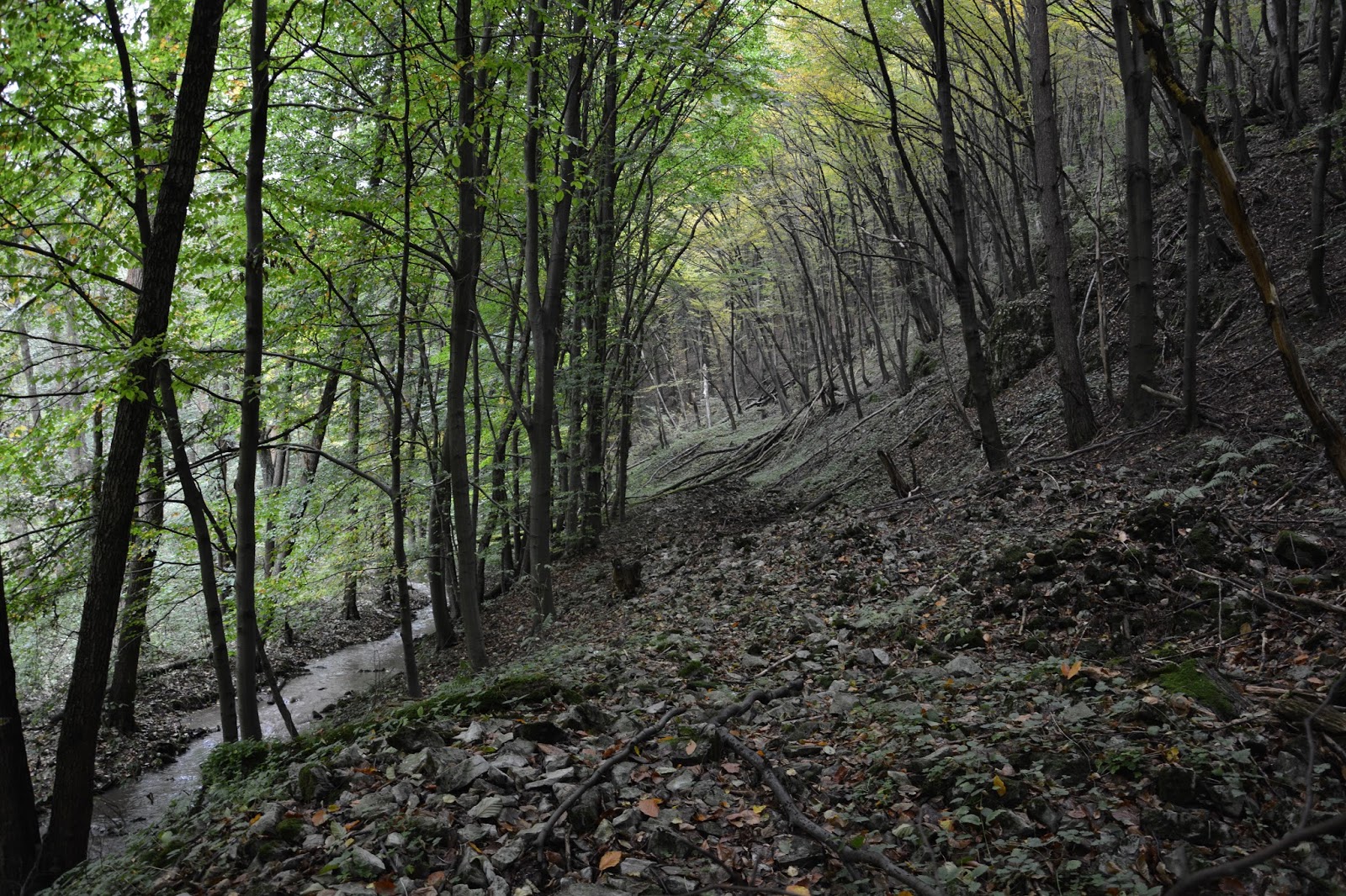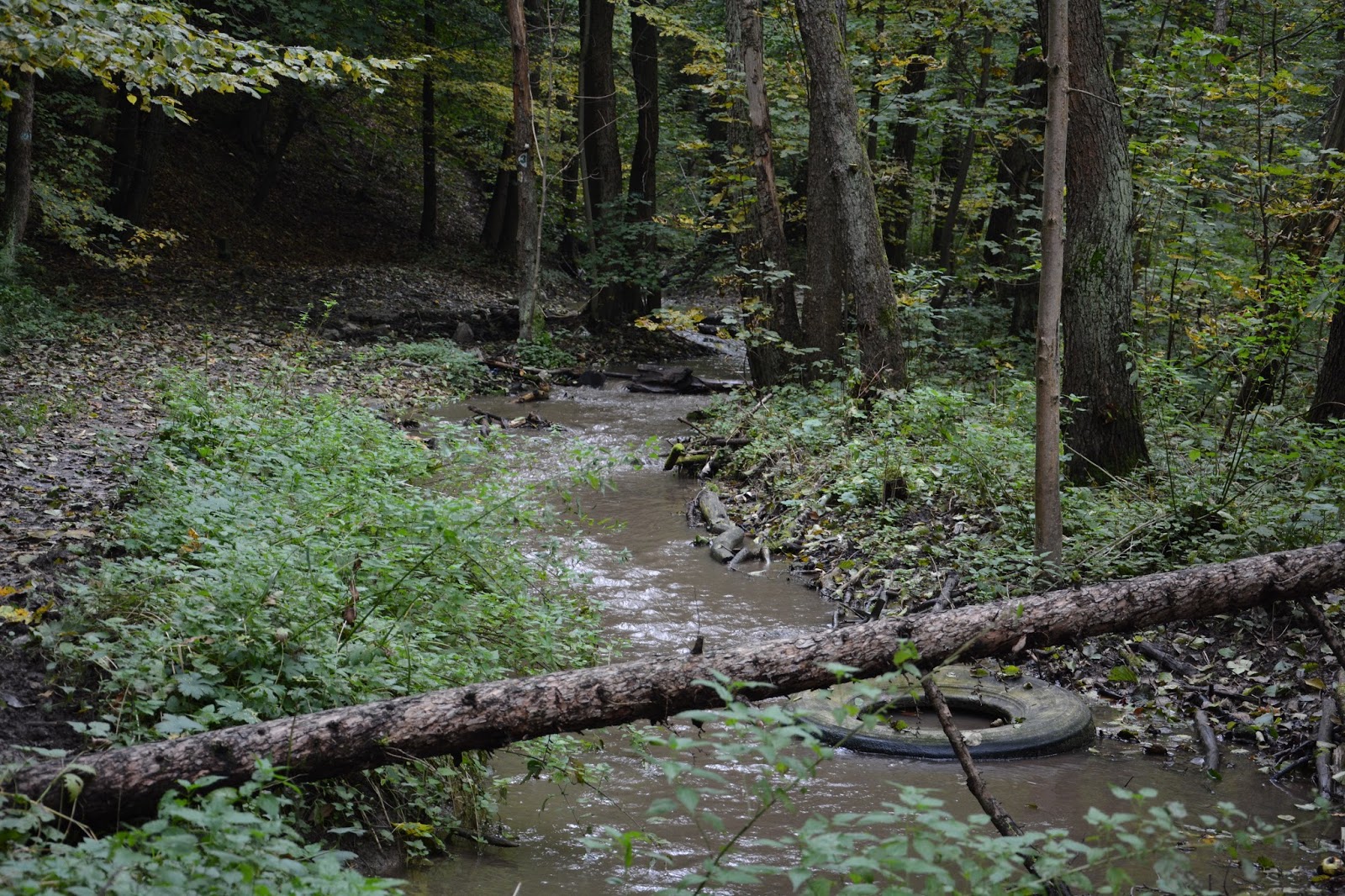 Robimy szlakiem łuk i wracamy do drogi asfaltowej, którą przekraczamy i schodzimy w dół do rzeki, nieźle zaśmieconej niestety.
