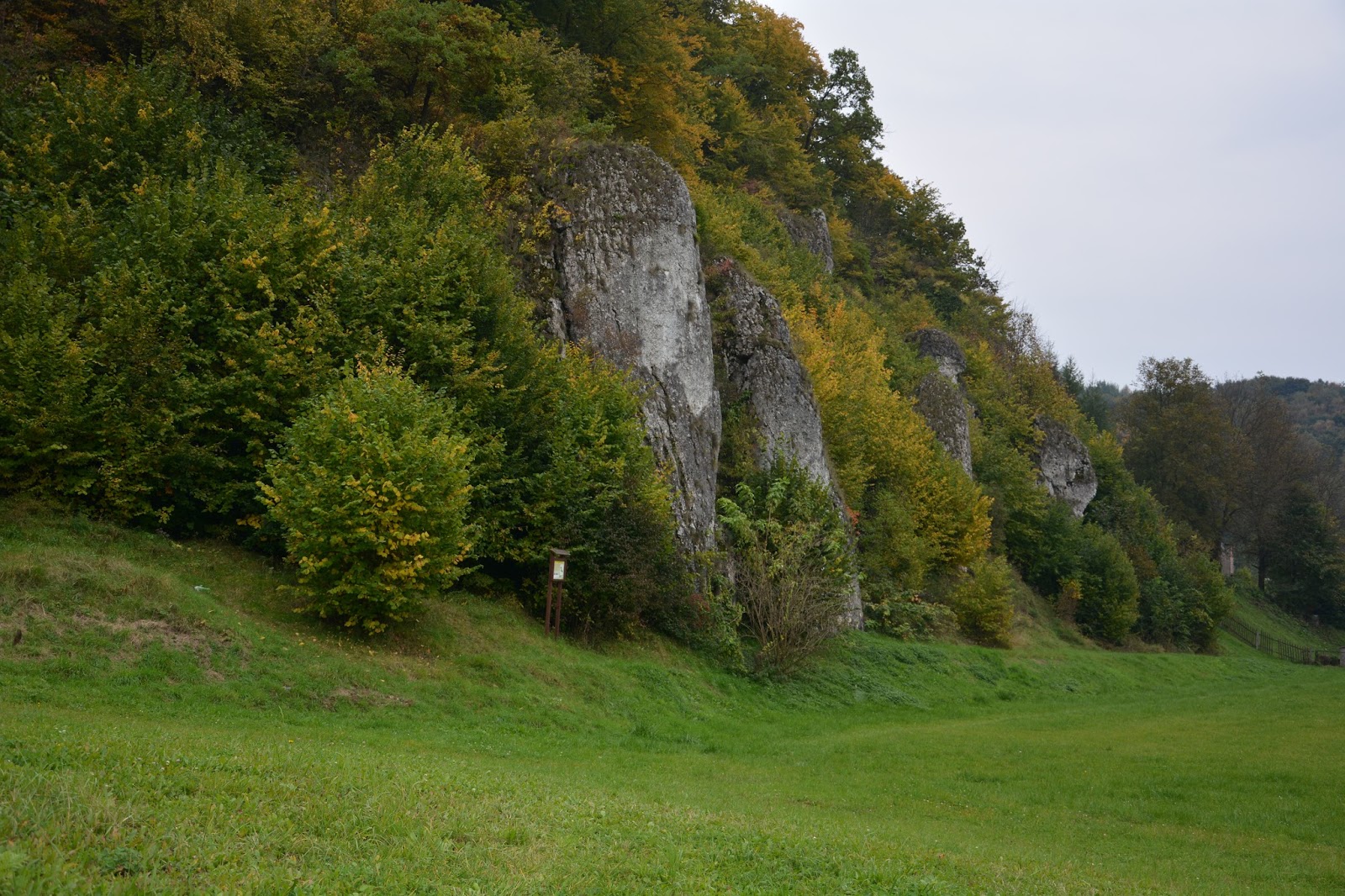 Kolejną ścieżką w Dolinie Racławki, którą przedreptaliśmy była oznaczona kolorem żółtym. Znów zaparkowaliśmy na tym samym parkingu na końcu wsi Dubie. I stąd ruszyliśmy po znakach, więc najpierw asfaltem w górę. Po prawej las, po lewej las. Czasem w tym lesie występy skalne: