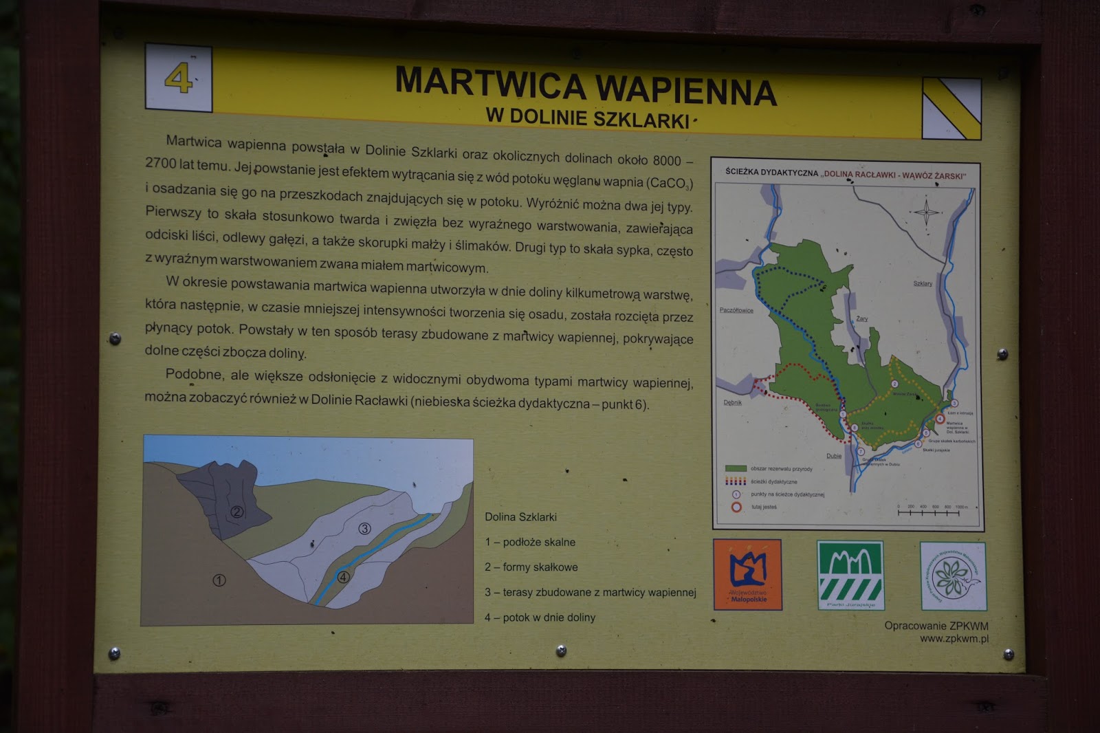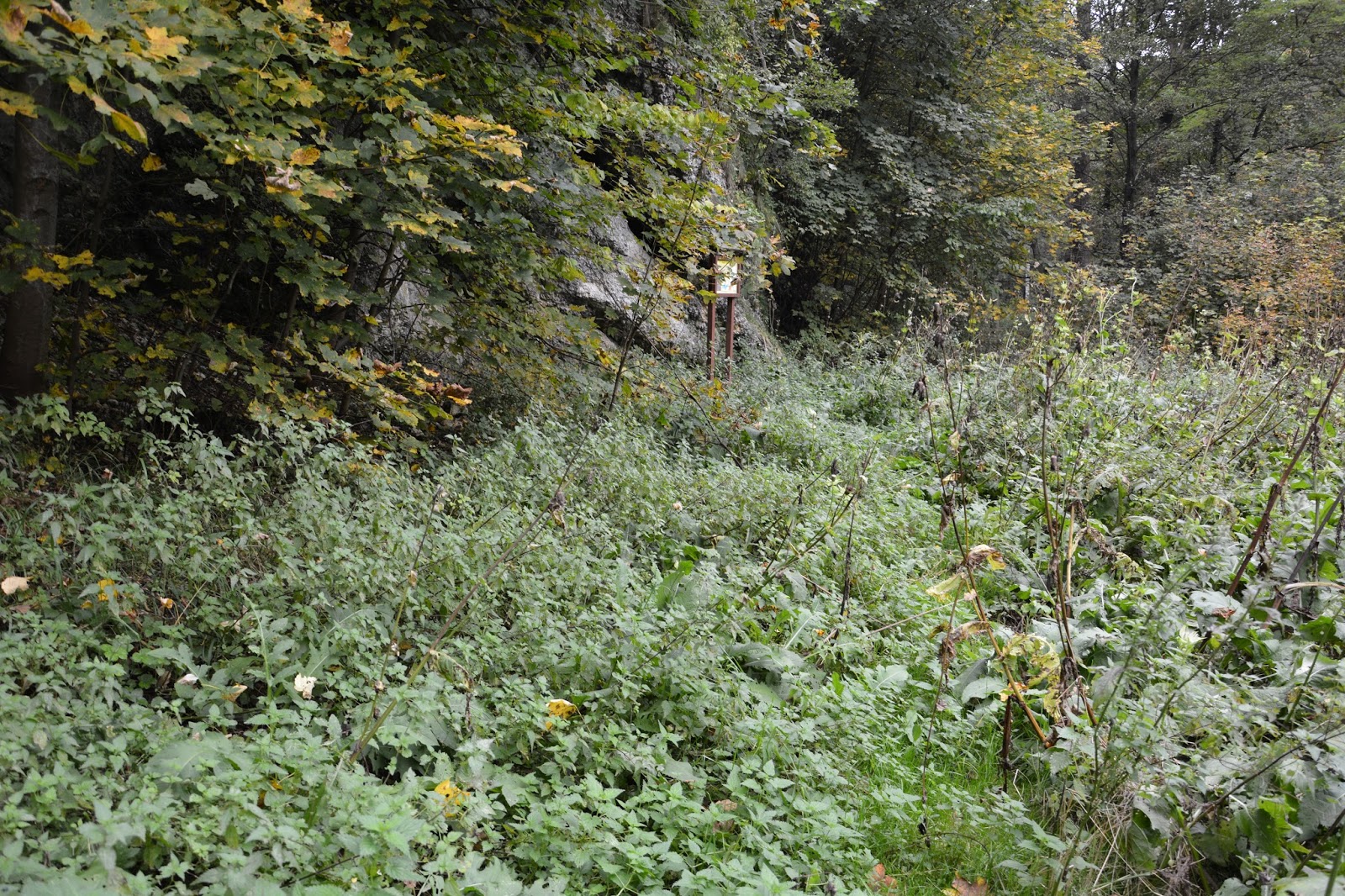 Przeskakujemy rzekę, idziemy chwilę w górę jej biegu, ale niestety prowadzi nas to na manowce, gubimy trasę do tablicy nr 3. Zawracamy i idziemy w dół rzeki, Po chwili w zakolu w krzakach i wysokich pokrzywach zauważamy wystającą tablicę. Pokrzywy są dość wysokie i ostro parzące, nawet nasz pies idzie opłotkami, bo nie daje rady. Ale przedzieramy się do miejsca z martwicą wapienną.