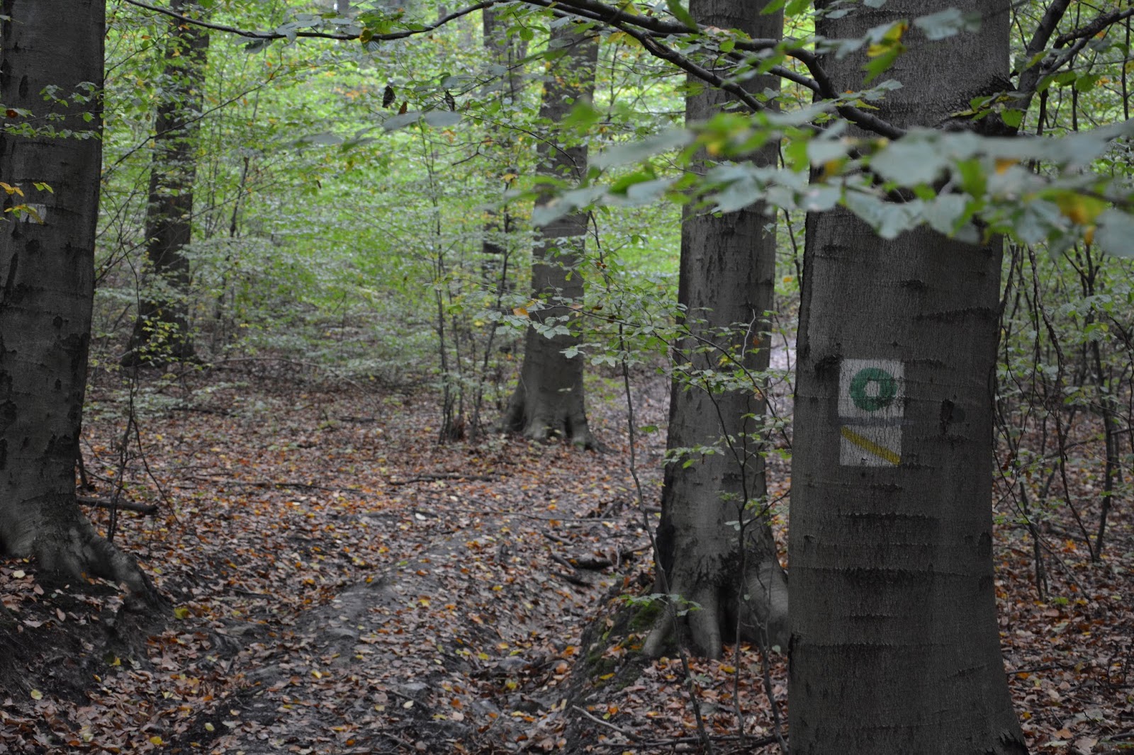 Po jakichś dwustu metrach skręcamy w leśną drogę w prawo, mijamy szlaban, i kroczymy szlakiem:
