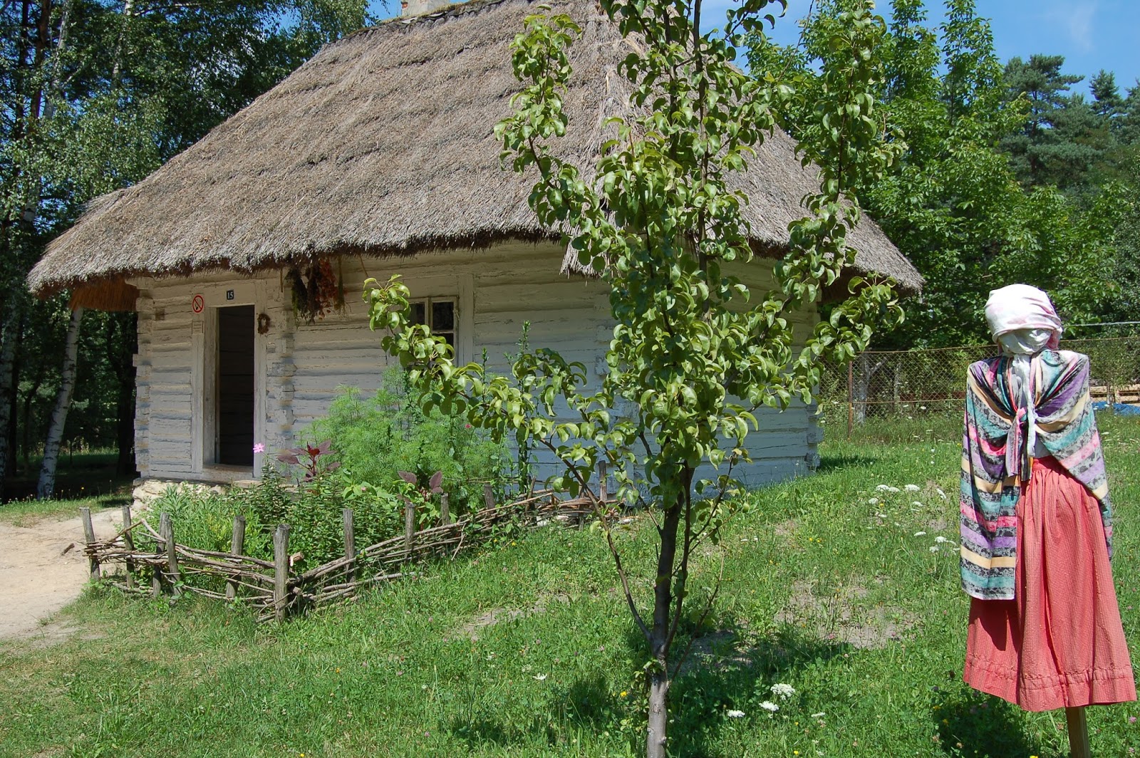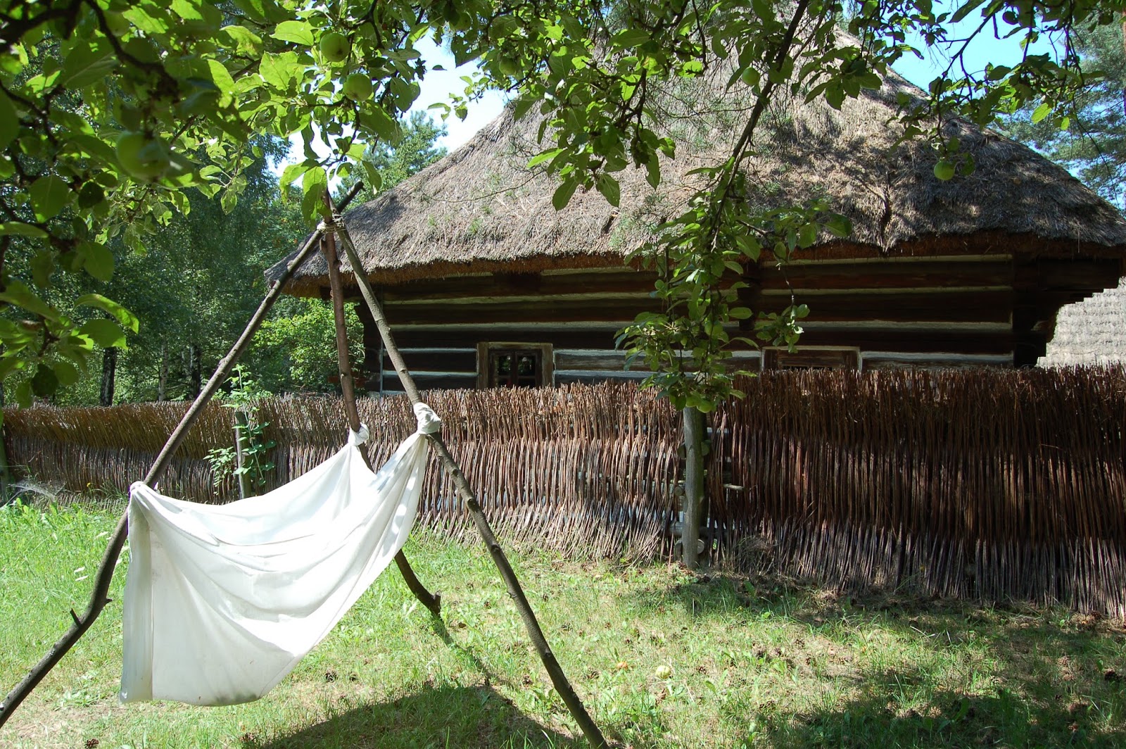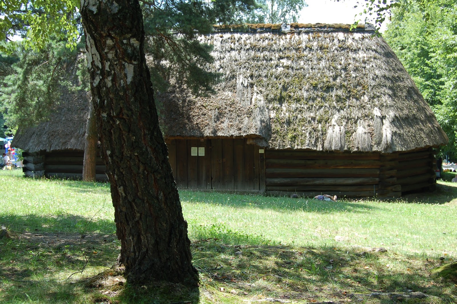 myte, szpary bielone wapnem, dach czterospadowy kryty strzechą. We