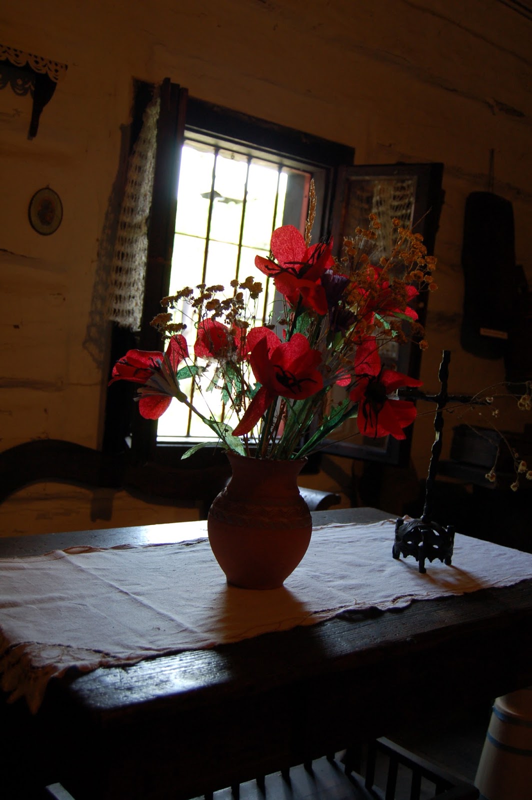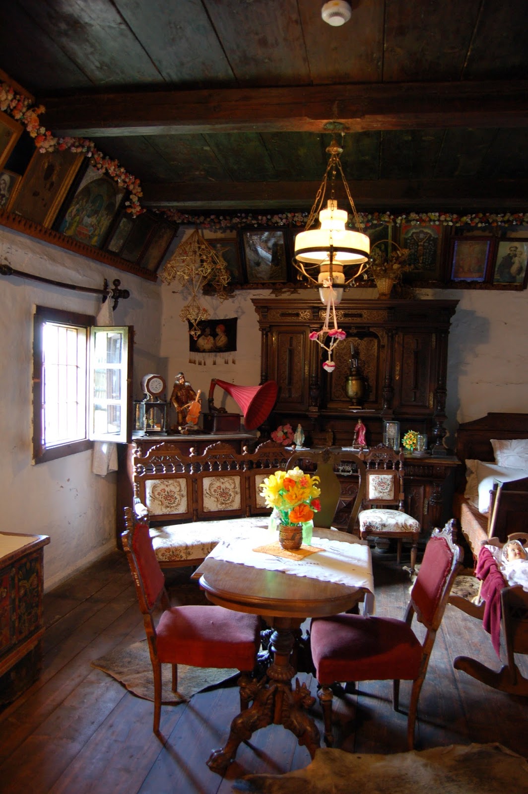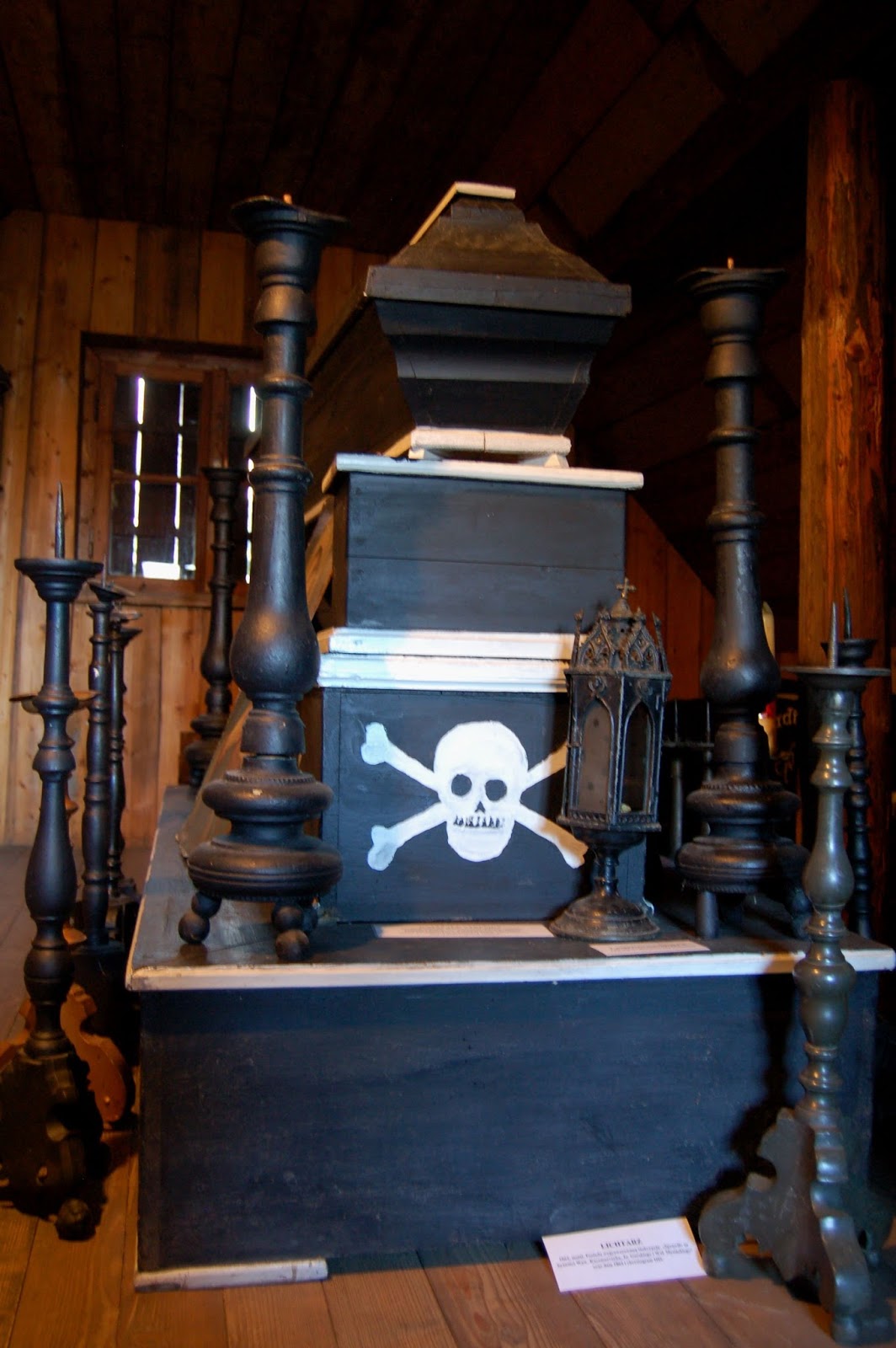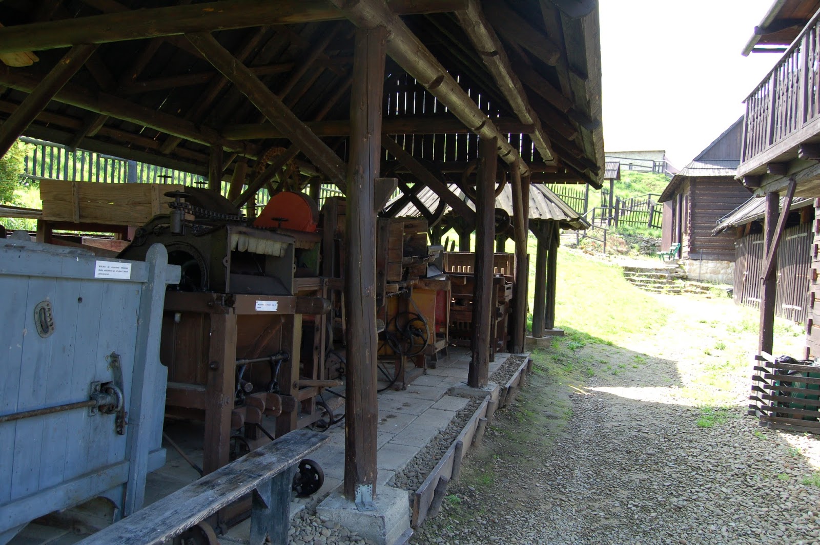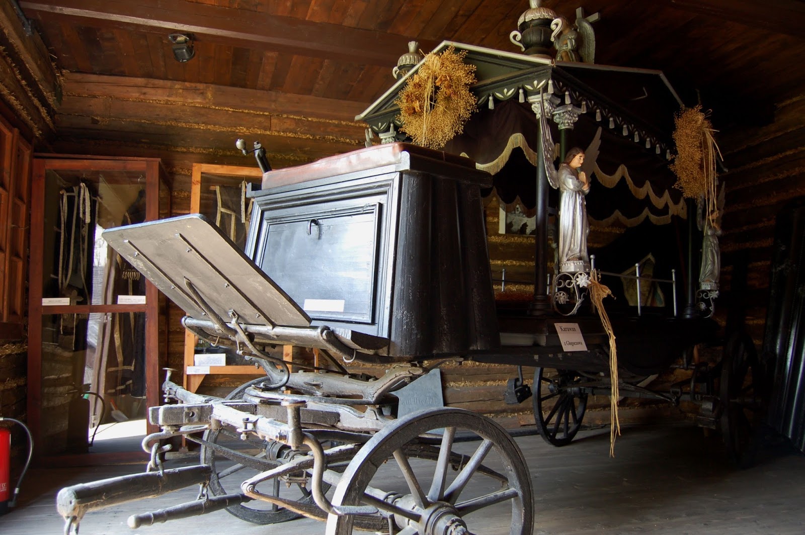a potem skręcamy do skansenu. Przechodzimy przez bramkę i wchodzimy do pierwszego z sześciu budynków tworzących to muzeum, a mianowicie zbudowanego z bali, uszczelnionego słomą, krytego gontem domu pogrzebowego. Znajdziemy tu cały zestaw przedmiotów związanych z tym obrzędem.