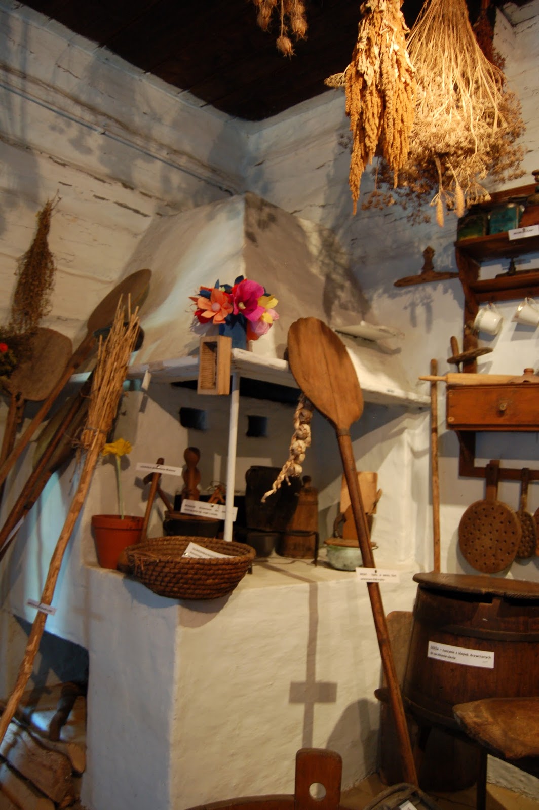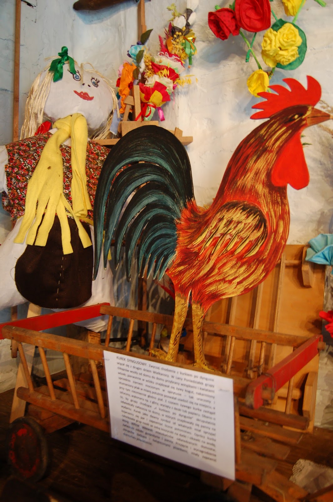 Czegoś nowego dowiedzieliśmy się w tym skansenie? A tak. Poznaliśmy zwyczaj “Kurka dyngusowego” (zdjęcie z kogutem powyżej). W Lany Poniedziałek (drugi dzień Wielkanocy) grupy chłopców woziły po wsi przybrany wstążkami i kwiatami wózek z żywym kogutem, upojonym ziarnem namoczonym w spirytusie, dzięki czemu siedział w wózku i jednocześnie głośno piał. Z czasem zastąpiono go kurkiem wykonanym z gliny lub wyciętym z drewna lub tektury. Kurek, jako symbol sił witalnych musiał odwiedzić każdy dom, w którym były panny na wydaniu. Miał sprzyjać kojarzeniu par i licznemu potomstwu. Chłopcy wozili ze sobą również koszyk na datki oraz naczynia z wodą, bo to przecież Lany Poniedziałek. Każdy dbał o to by nie pominęli jego domu, bo wizyta Kurka miała zapewnić domostwu szczęście…