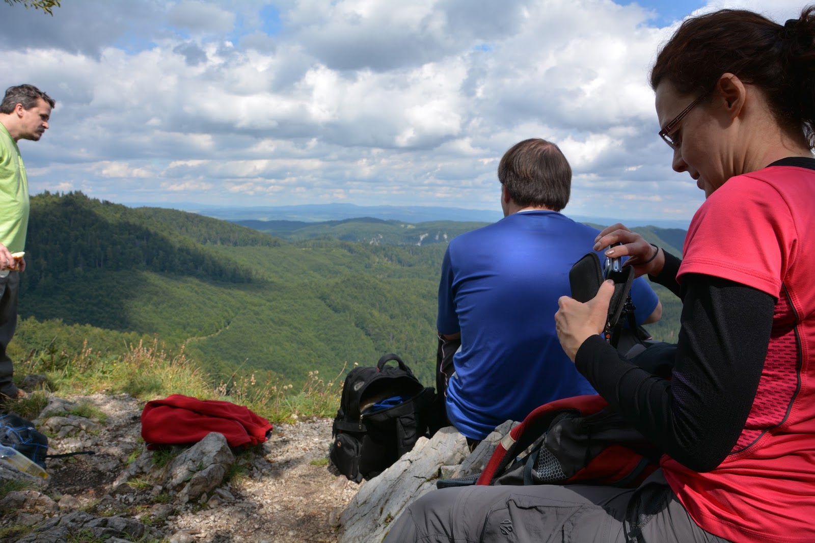 Po kilkunastu minutach docieramy na szczyt. Niewiele tu miejsca, ale jakość ta nasza mieszanina słowiańska: polsko-słowacko-czeska się mieści. Urządzamy mały piknik na wiszącej skale z pięknym widokiem: