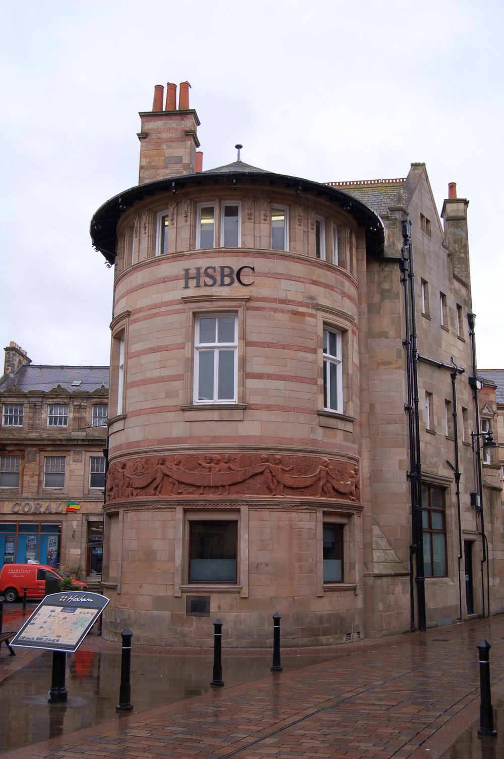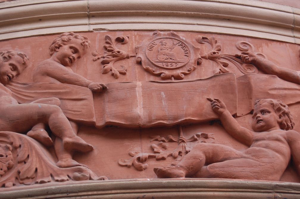 Budynek Midland Banku, obecnie HSBC, z ozdobnym gzymsem dookoła – można pokusić się o odnalezienie medalionu z królową Wiktorią:
