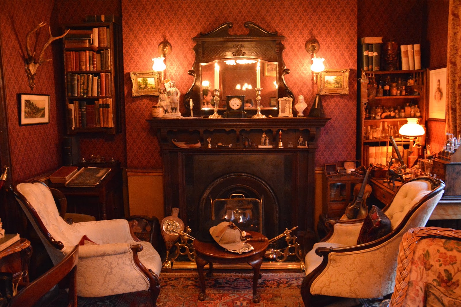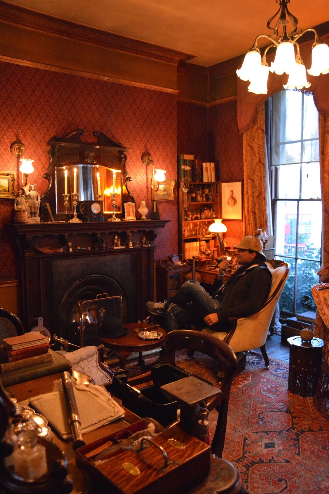 Pod numerem 221B pod drzwiami (oprócz długiej kolejki, zwłaszcza w weekendy) stoi wystylizowany na “Victorian London Bobby” (poufale o policjancie;). W sklepiku muzealnym na parterze kupujemy bilet (10£) i jeśli jest kolejka do muzeum na zewnątrz to w niej stajemy, jeśli nie (bo jest poniedziałek/wtorek przed południem) to Bobby wpuszcza drzwiami znajdującymi się wewnątrz sklepiku.Na piętrach znajdują się zrekonstruowane (na podstawie opisów z książek) pokoje, przy czym najważniejszy oczywiście jest salon z kominkiem oraz sherlockowskimi gadżetami.